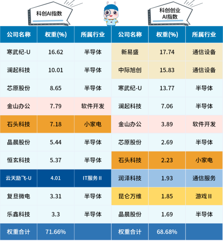 总结而言,科创 AI 指数的成份股更聚焦科创板硬科技,侧重AI芯片与应用端;科创创业 AI 指数则兼顾科创板与创业板,行业分布更均衡,覆盖了通信设备、AI多元应用等行业领域,形成了跨板块、多行业的成份股矩阵。