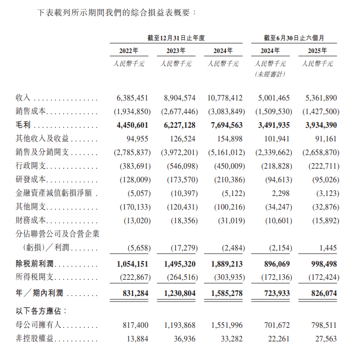 得益于旗下多个品牌销量亮眼,珀莱雅的总营收在近三年持续增长。财务数据显示,2022年至2024年及今年上半年,珀莱雅的收入分别为63.85亿元、89.05亿元、107.78亿元、53.62亿元;期内利润分别为8.31亿元、12.31亿元、15.85亿元、8.26亿元。