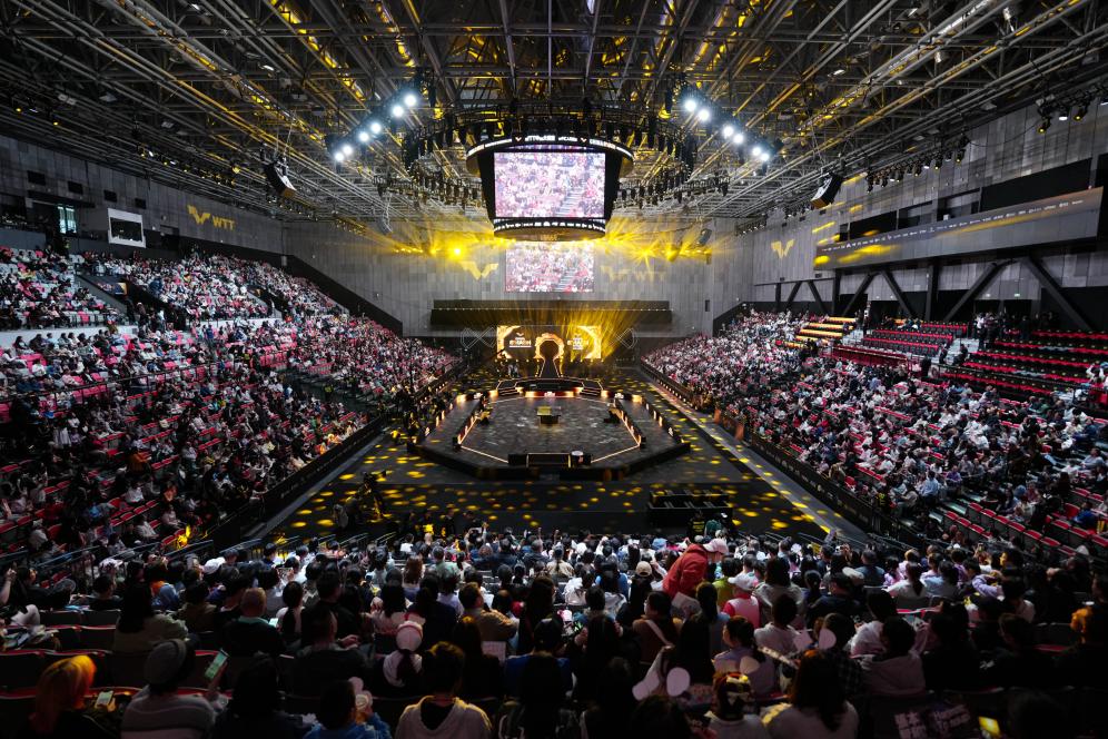 10月3日,人们在北京首钢园区观看世界乒乓球职业大联盟(WTT)中国大满贯赛。新华社记者 张晨霖 摄