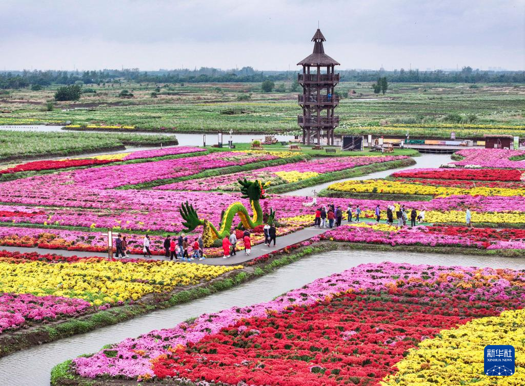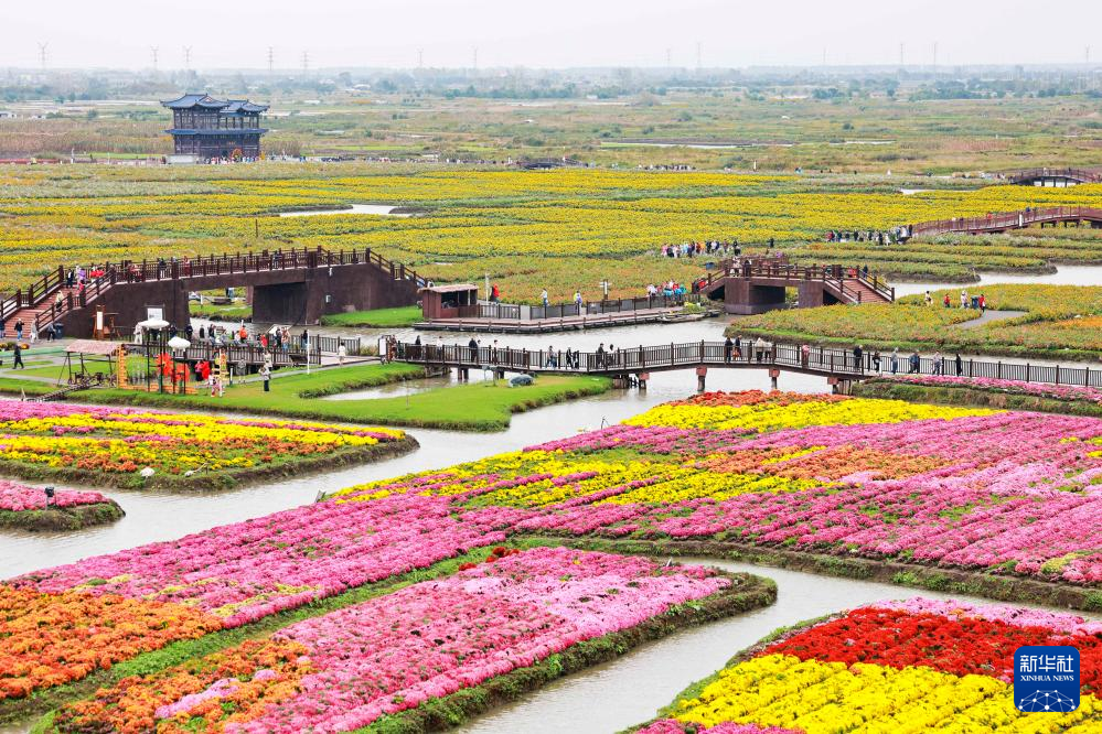 10月18日,游客在江苏省兴化市千垛景区赏花游玩。