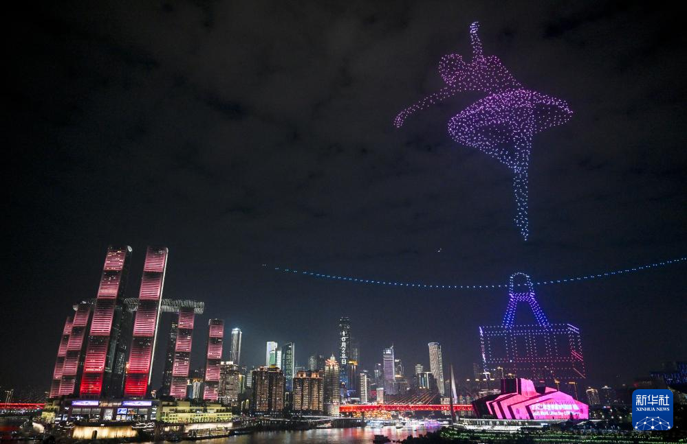 这是10月27日晚在重庆市南岸区南滨路拍摄的世界城市日专场无人机灯光秀表演活动。