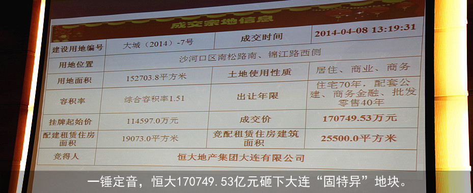 恒大17億大連奪地"固特異" 業(yè)內(nèi)熱議"值不值"?今日,大連年度最熱固特異地塊經(jīng)過數(shù)個(gè)小時(shí)148輪加價(jià),終于被恒大地產(chǎn)集團(tuán)大連有限公司以170749.53萬元加配25500平方米保障房競得,然而花落恒大雖塵埃落定,但固特異地塊何以引得房企大鱷如此鐘情又是否值得如此高價(jià),引發(fā)了業(yè)內(nèi)關(guān)注度的二次發(fā)酵。[詳情] |