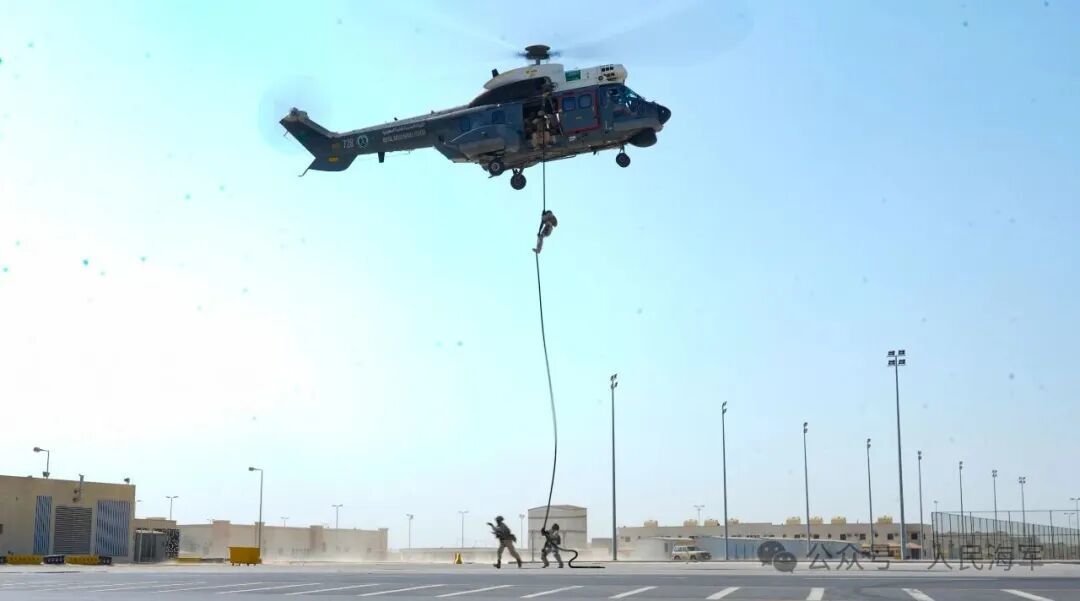 ▲中沙双方参训队员协同开展直升机滑降训练