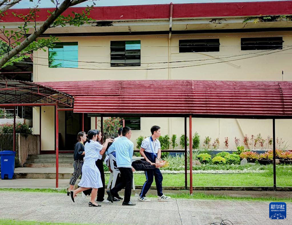 10月10日,在菲律宾南阿古桑省一所大学,地震中受伤人员被撤离至建筑物外并接受治疗。