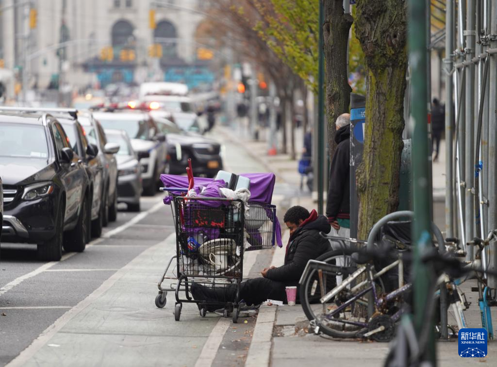 11月21日,在美国纽约一处无家可归者救助点附近,一名无家可归者露宿街头。