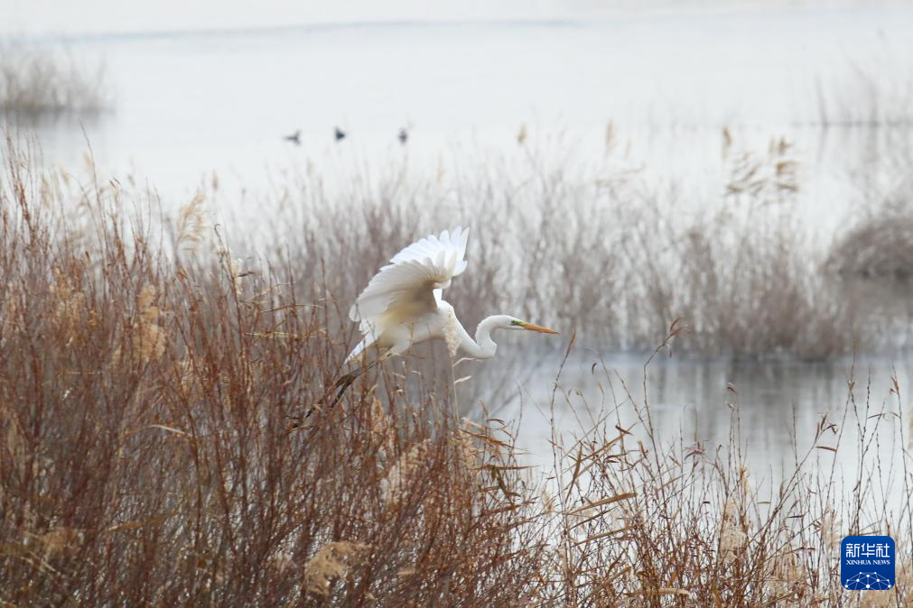 11月22日,在河西走廊东端的甘肃民勤石羊河国家湿地公园,大白鹭在红崖山水库飞翔。
