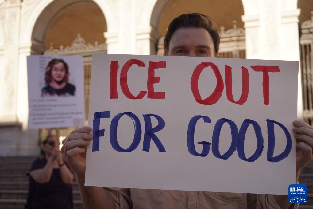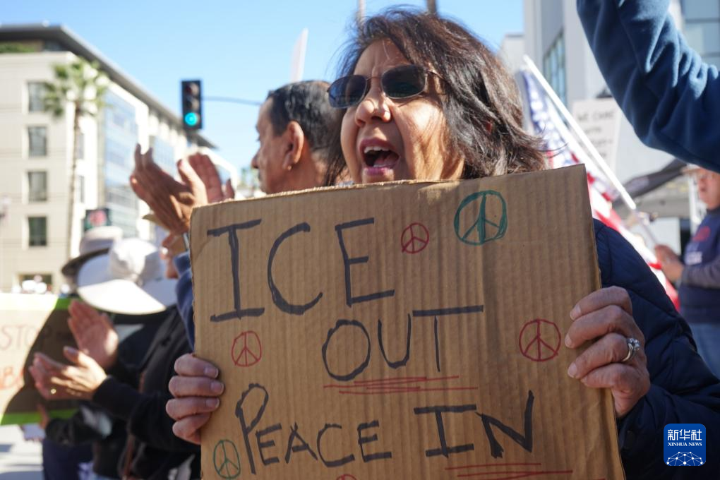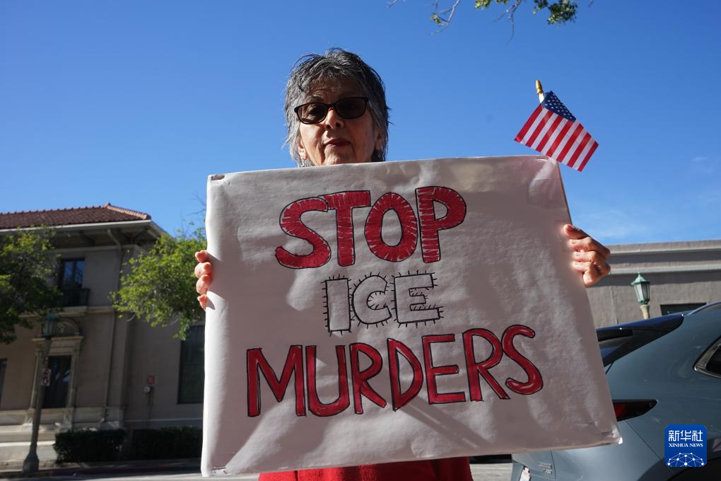 1月10日,在美国加利福尼亚州洛杉矶县帕萨迪纳市,一名抗议者手持标语牌参加抗议活动。