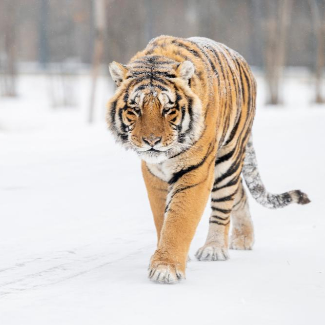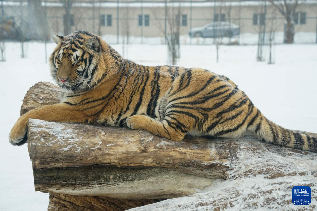 1月12日,冰城哈尔滨市迎来降雪天气,在黑龙江东北虎林园,散放区的东北虎在雪地活动。