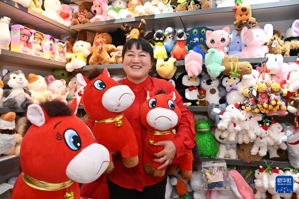 1月12日,在浙江义乌市国际商贸城一区玩具销售区,市场经营户“开心姐妹”负责人张火清展示销售的“哭哭马”小马公仔玩具。