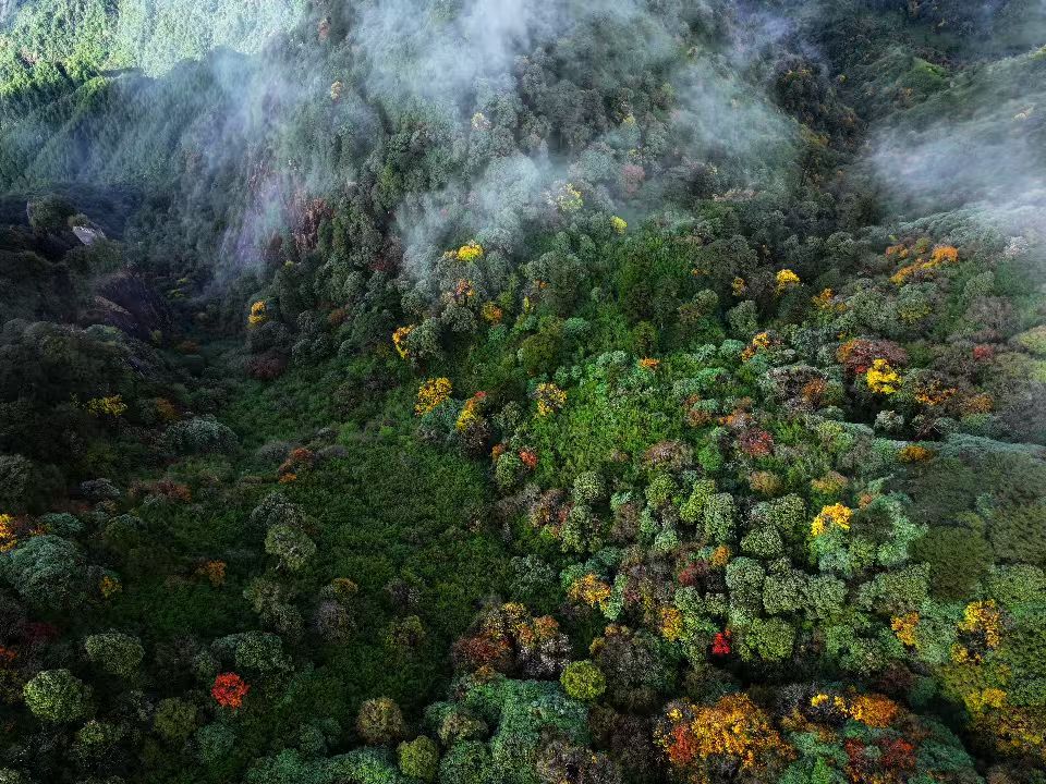 初冬時(shí)節(jié),走進(jìn)云南省騰沖市猴橋鎮(zhèn)輪馬村粉竹壩,層林盡染,五彩斑斕,彩色山林如巨幅油畫鋪展于群山之間。薄霧繚繞中,山林靜謐而幽遠(yuǎn),構(gòu)成一幅濃墨重彩的冬日畫卷。