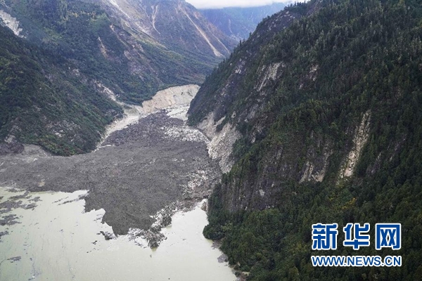 空中俯瞰堰塞湖和堰塞體(10月18日攝)。新華社記者 普布扎西攝