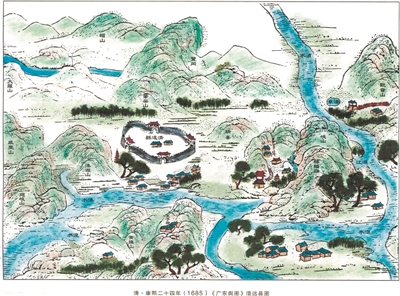 清代康熙年間的清遠(yuǎn)地圖, 用中國山水畫中的散點(diǎn)透視的技法繪制。