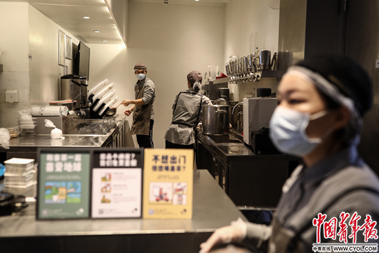 喜茶漢街LAB店和大多數(shù)店鋪一樣暫停營(yíng)業(yè)了。2月22日,中青報(bào)·中青網(wǎng)記者實(shí)地探訪時(shí)發(fā)現(xiàn),空空蕩蕩的店鋪里擺著一排排裝滿食物的紙袋,10名工作人員戴著口罩,如往常一樣在忙碌地制作奶茶和面包。