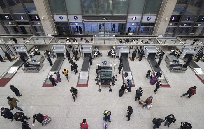4月7日晚,旅客接受安檢后進(jìn)入武昌火車(chē)站。新華社記者 費(fèi)茂華 攝