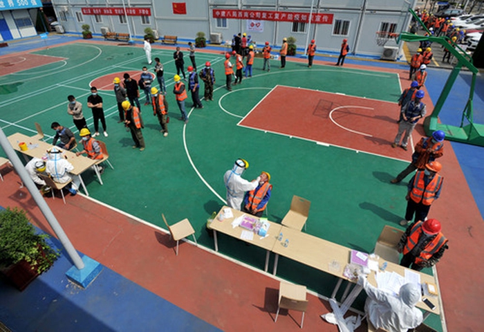 在中建八局武漢中央文化區(qū)萬(wàn)達(dá)項(xiàng)目部,返崗員工4月7日在接受核酸和抗體指標(biāo)檢測(cè)。 新華社發(fā)(史偉 攝)
