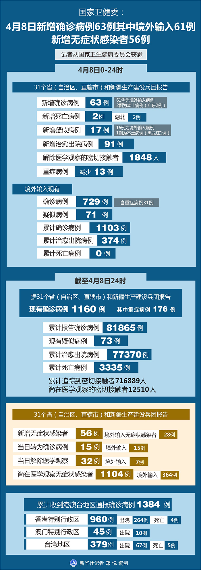 新華社北京4月9日電(記者張辛欣、田曉航)國家衛(wèi)健委9日通報,4月8日0-24時,31個?。ㄗ灾螀^(qū)、直轄市)和新疆生產(chǎn)建設(shè)兵團(tuán)報告新增確診病例63例,其中61例為境外輸入病例,2例為本土病例(廣東2例);新增死亡病例2例(湖北2例);新增疑似病例17例,其中16例為境外輸入病例,1例為本土病例(黑龍江1例)。