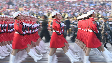 當(dāng)天上午10時(shí)許,雄壯的樂曲聲中,習(xí)近平乘坐紅旗牌檢閱車,沿長(zhǎng)安街向東,依次檢閱了地面徒步方隊(duì)和裝備方隊(duì)。