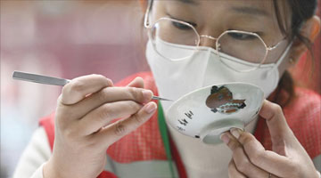 参加陶瓷文物修复师比赛项目的选手在现场进行文物修复(3月25日摄)。