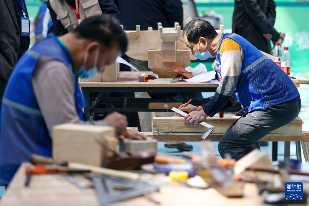参赛选手在木作文物修复师比赛现场紧张竞技(3月25日摄)。