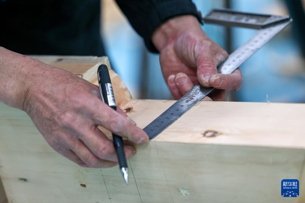 参加木作文物修复师比赛项目的选手在现场制作木质传统建筑构件(3月25日摄)。