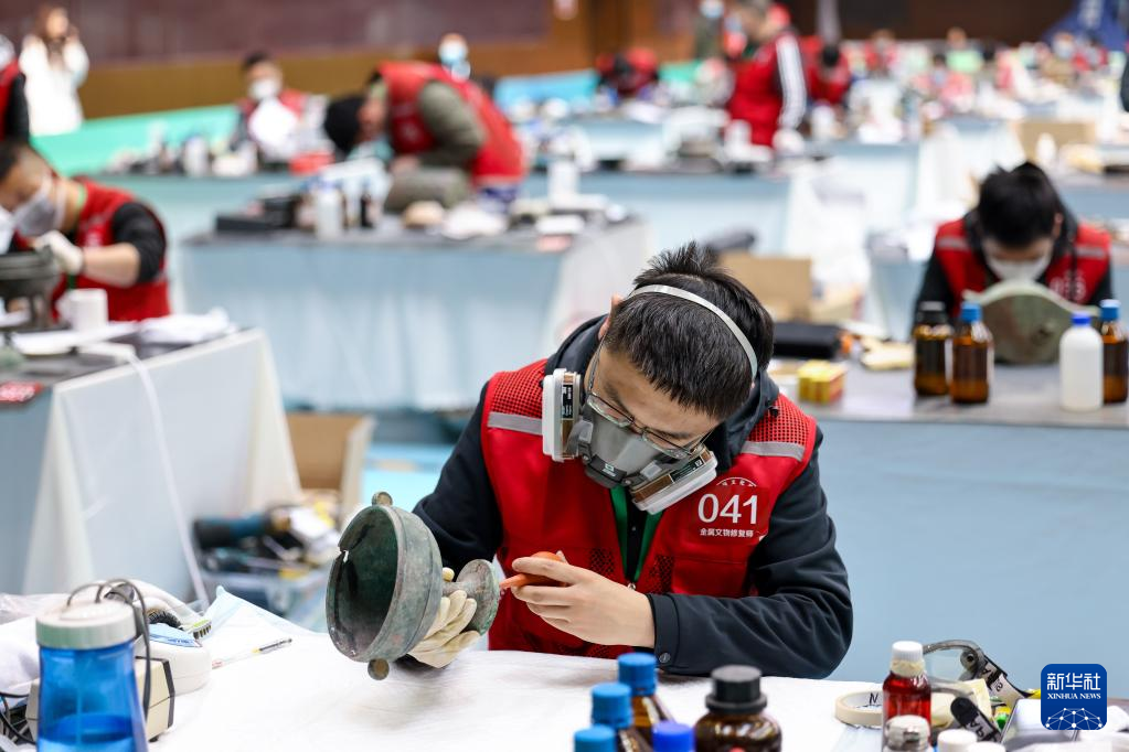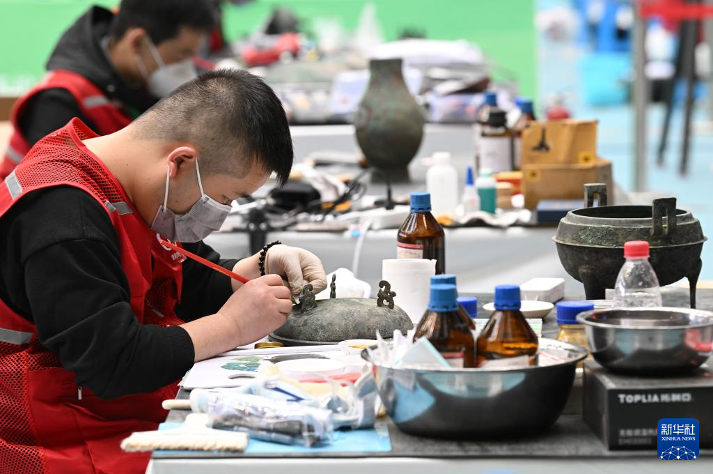 参加金属文物修复师比赛项目的选手在现场进行文物修复(3月24日摄)。