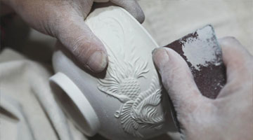 4月19日,在宝丰县一家汝瓷企业生产车间,汝瓷艺人在修饰汝瓷素坯。