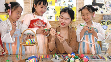 5月7日,在哈尔滨国际会展体育中心,外国参展商在首届东北亚文化艺术创意设计博览会上摆放参展商品。