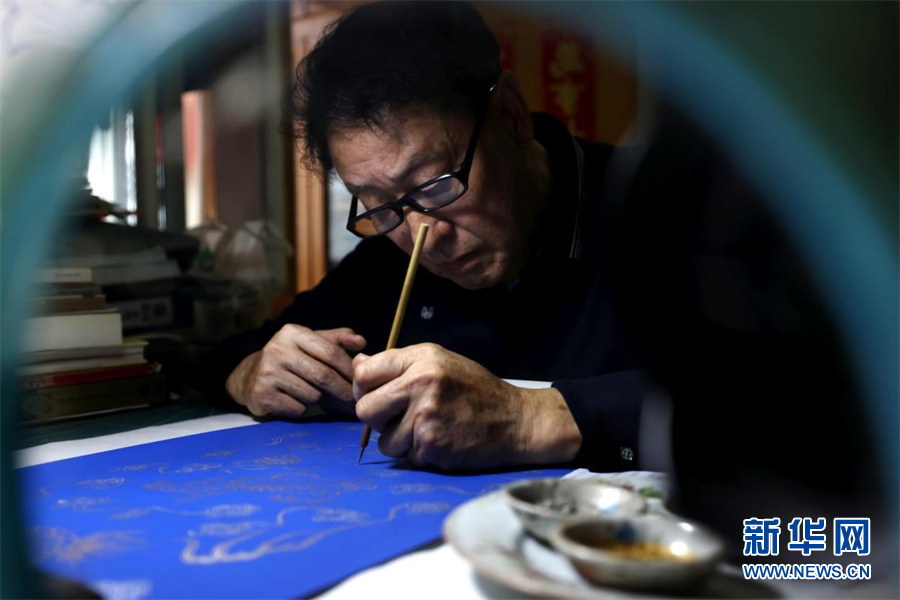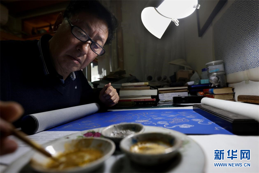 近日,宫廷描金纸省级非遗传承人范发生在进行描金纸画稿拷贝。