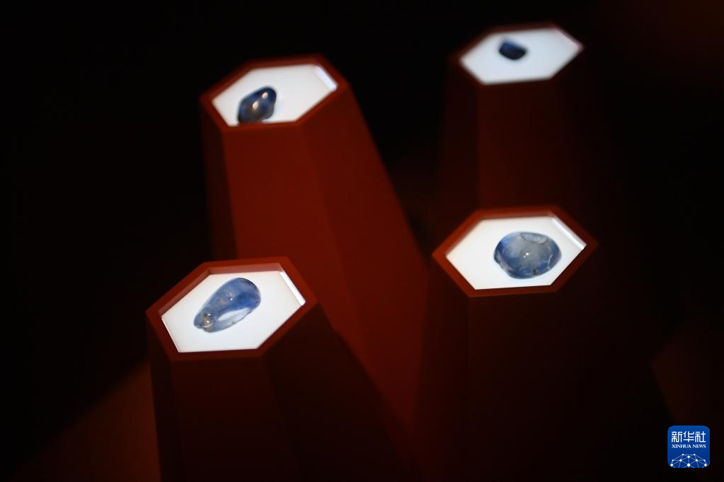 这是在陕西历史博物馆拍摄的蓝宝石(5月11日摄)。天然宝石通过丝绸之路以商业贸易的形式进入中国。