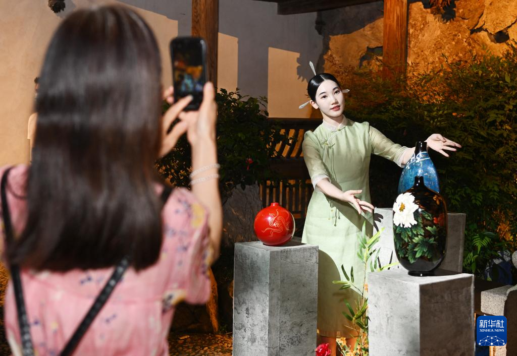 5月18日,观众在福州市三坊七巷历史文化街区参观拍摄传统漆器工艺品的沉浸式实景展示。