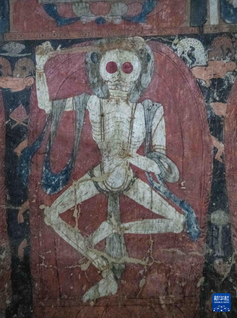这是5月26日拍摄的皮央石窟壁画中的骷髅造型。