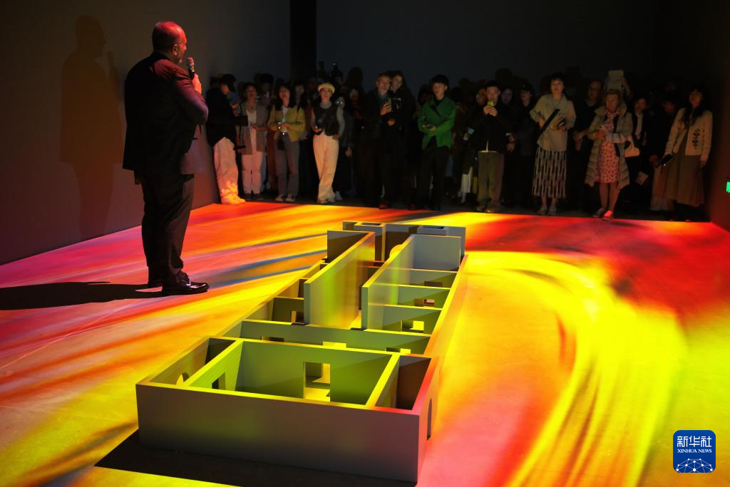 11月8日,“宇宙电影——第14届上海双年展”在上海当代艺术博物馆举行开幕式,策展人在为观众导览。