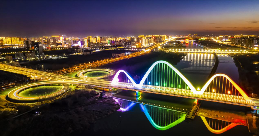 夜幕下的姑射桥,流光溢彩。新华网 发(李虎威 摄)