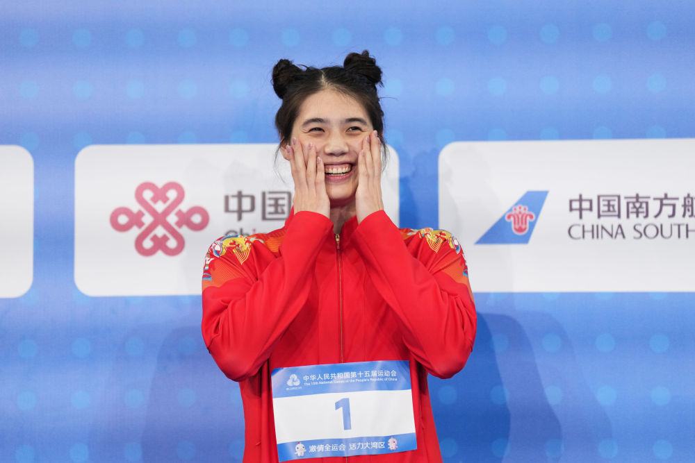 11月16日,获得冠军的江苏队张雨霏在颁奖仪式上。新华社记者 丁增尼达 摄