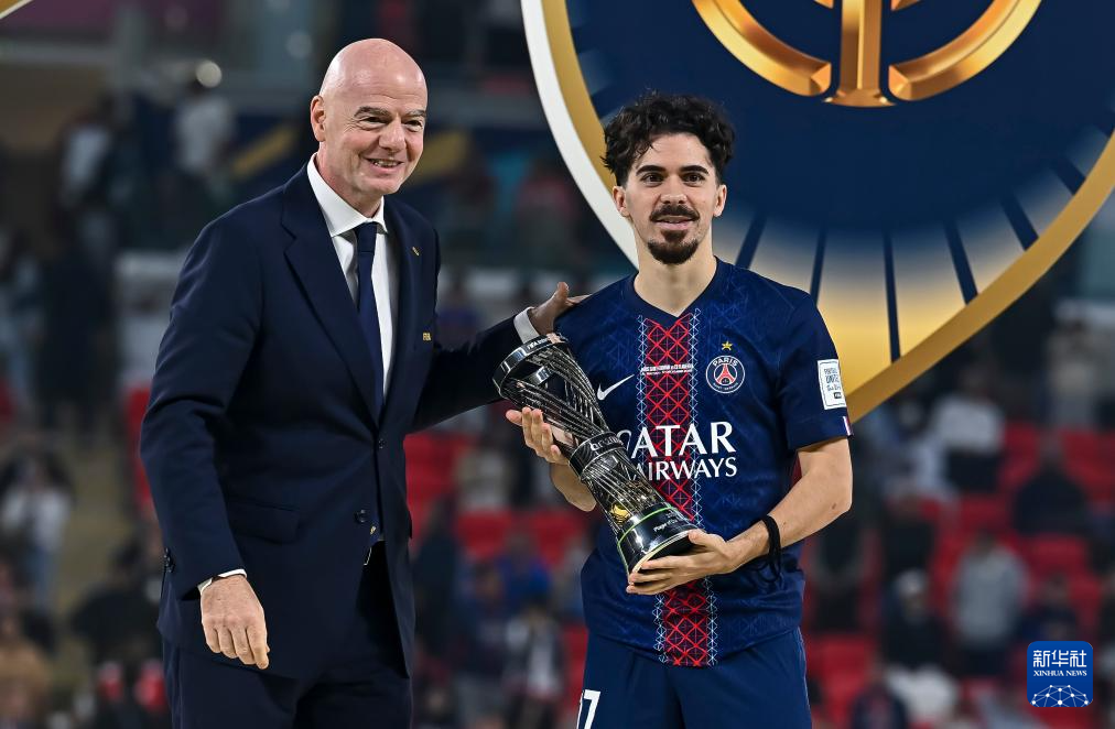 12月17日,国际足联主席因凡蒂诺(左)为巴黎圣日耳曼队球员维蒂尼亚颁发赛事最佳球员奖杯。