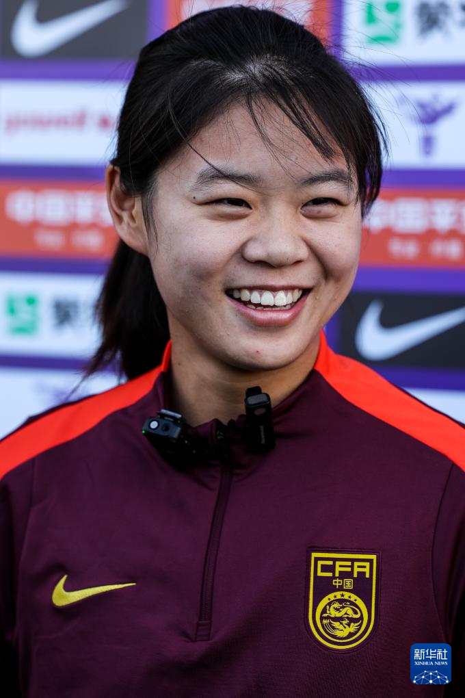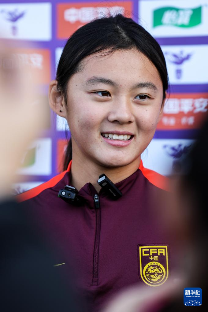 1月7日,中国U17女足队员杨睿雪在场边接受采访。