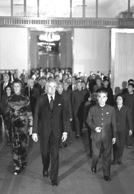 ????惠特拉姆被澳大利亞人譽(yù)為“澳中建交之父”。幾乎與基辛格博士秘密訪華同時,惠特拉姆1971年7月率澳大利亞工黨代表團(tuán)訪華?;萏乩反文贲A得選舉并出任澳大利亞總理后,立即推動了澳大利亞與新中國正式建交,使澳大利亞成為較早與新中國建交的西方國家之一。